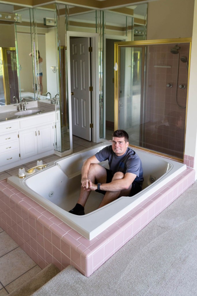 The bathrooms will probably be the first thing that we work on, because they’re in pretty rough shape. Only one shower is functional; the main bathroom has mold and it’s uh… mirrored and pink and kinda ugly… and the tiles are falling off the wall in the other spare full bath, but hey, we’ve seen worse, right? Also, the bathroom in the main bedroom suite is COMPLETELY open to the rest of the room. I don’t think that the builder valued privacy too much.