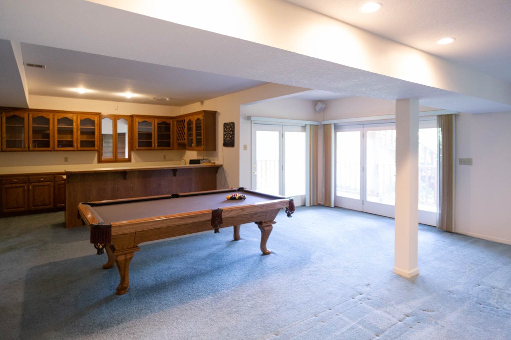 The basement will definitely be the cool hangout spot one day and we have BIG plans for it. Right now it’s just a lot of blue carpet and a saloon style bar. Did I mention the blue carpet runs into the bathroom? The bathroom that’s next to the bar? Yeah… gross.