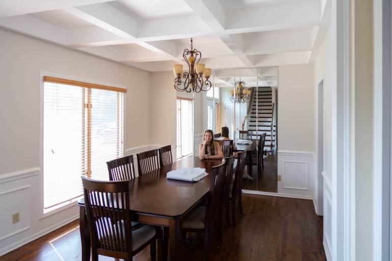 This is the first space you see when you enter the house, and it looks pretty much identical to the day we closed on the house, except that we took a leaf out of the table and rotated it 90 degrees. I’d like to remove the mirrors and redo the wainscoting. I’m considering making the wall treatment taller so it covers 2/3 of the wall and adding a picture ledge so we can prop up some vintage art and add some color to the space. Also on the dream list:get a rug, paint the space, hang some curtains, and build a sideboard to sit where the mirrors are currently.
