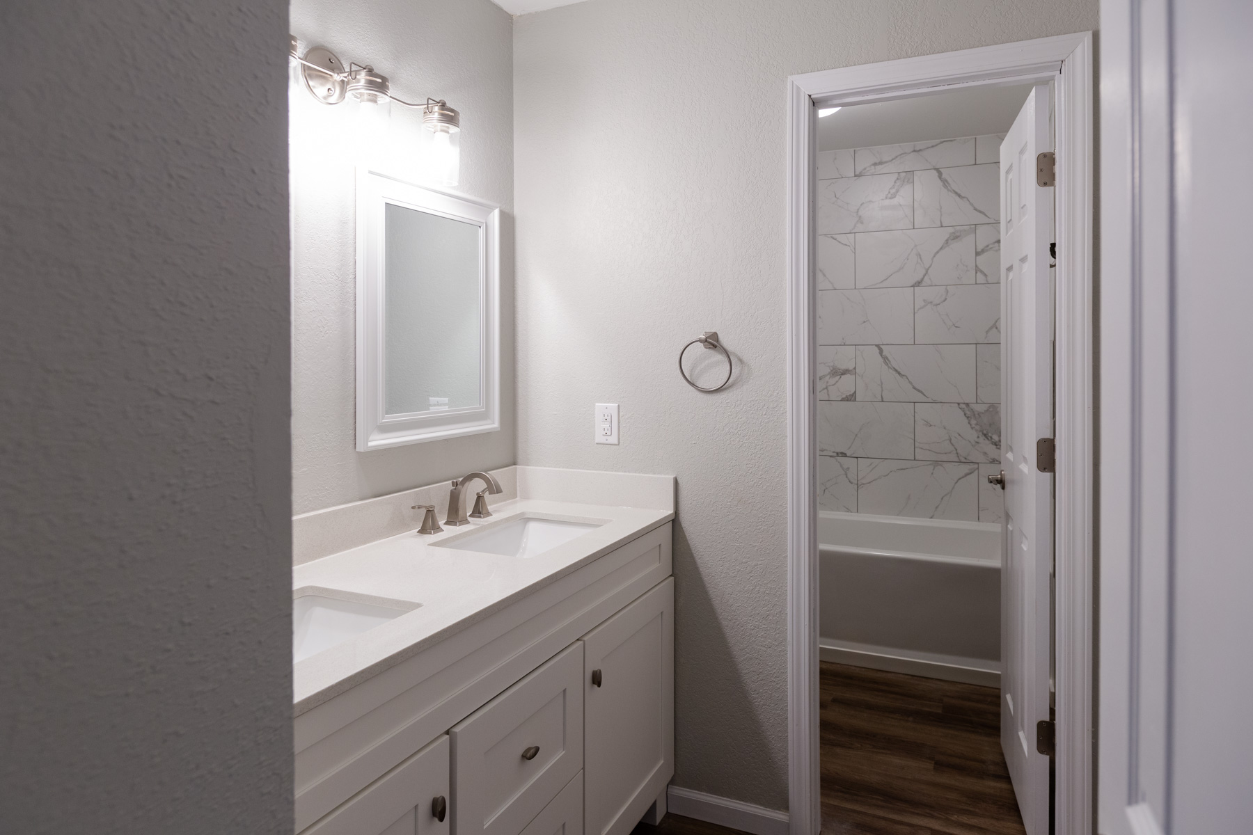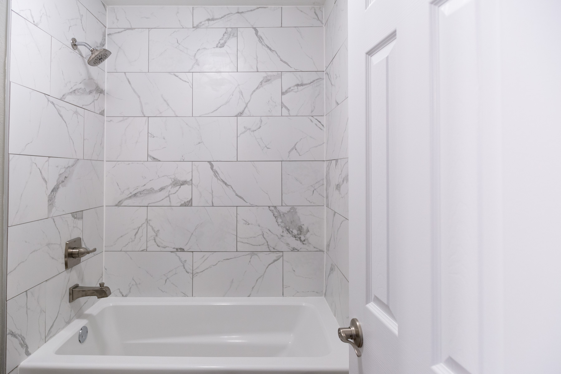 Also, here’s some friendly advice: if you find yourself in the middle of a global pandemic that’s causing record orders of home improvement supplies and massive shipping delays, don’t try to order a tub surround. It’ll come broken…twice. And then the shipping delay will cause the third one to be delivered months after you need it. Just tile the dang thing from the get go so you aren’t outside using a wet saw in December like us. Plus, it lasts longer, looks better, and actually ends up being cheaper anyway.