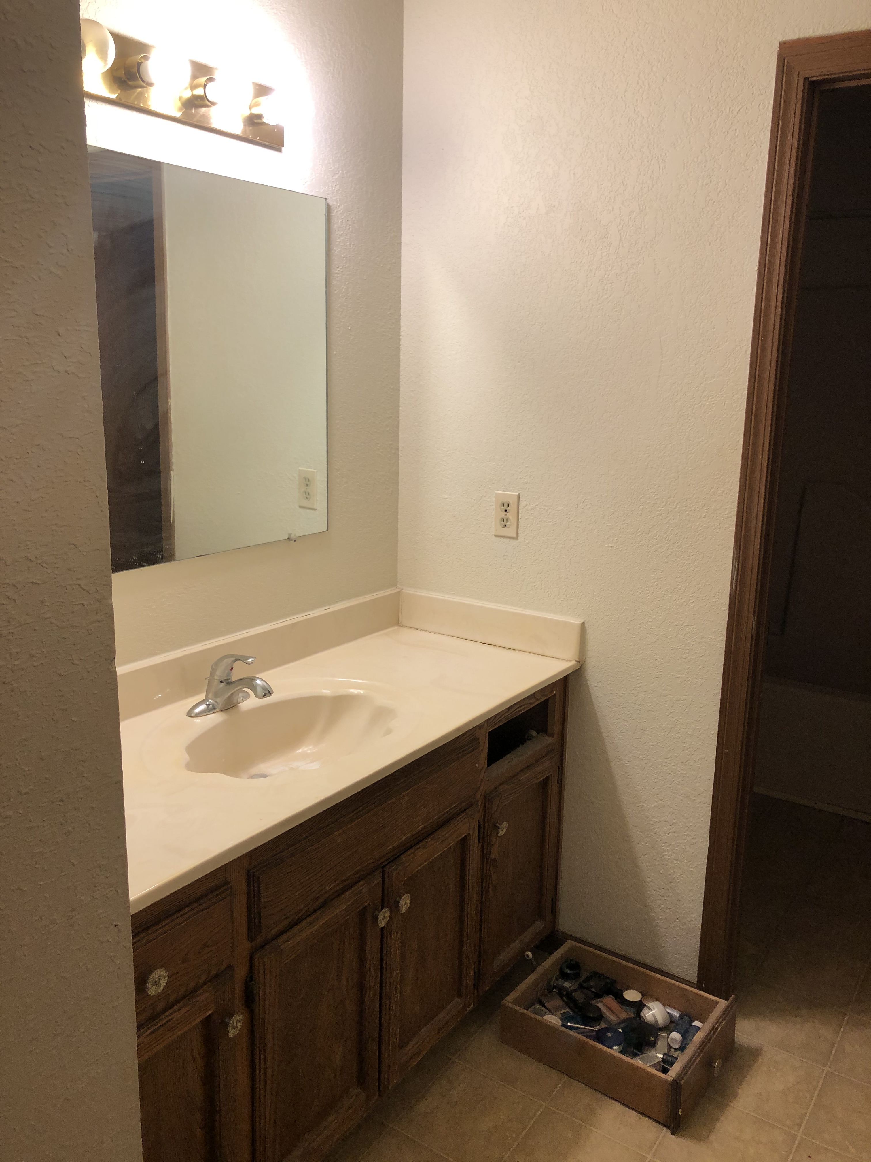 The bathroom upstairs was probably what was in the worst shape. Yes, worse than the salmon bathroom. Worse than the kitchen sink. Worse than potentially being crushed to death/being cut to death by glass shards from a fallen sliding door. Why? THE SINK.
