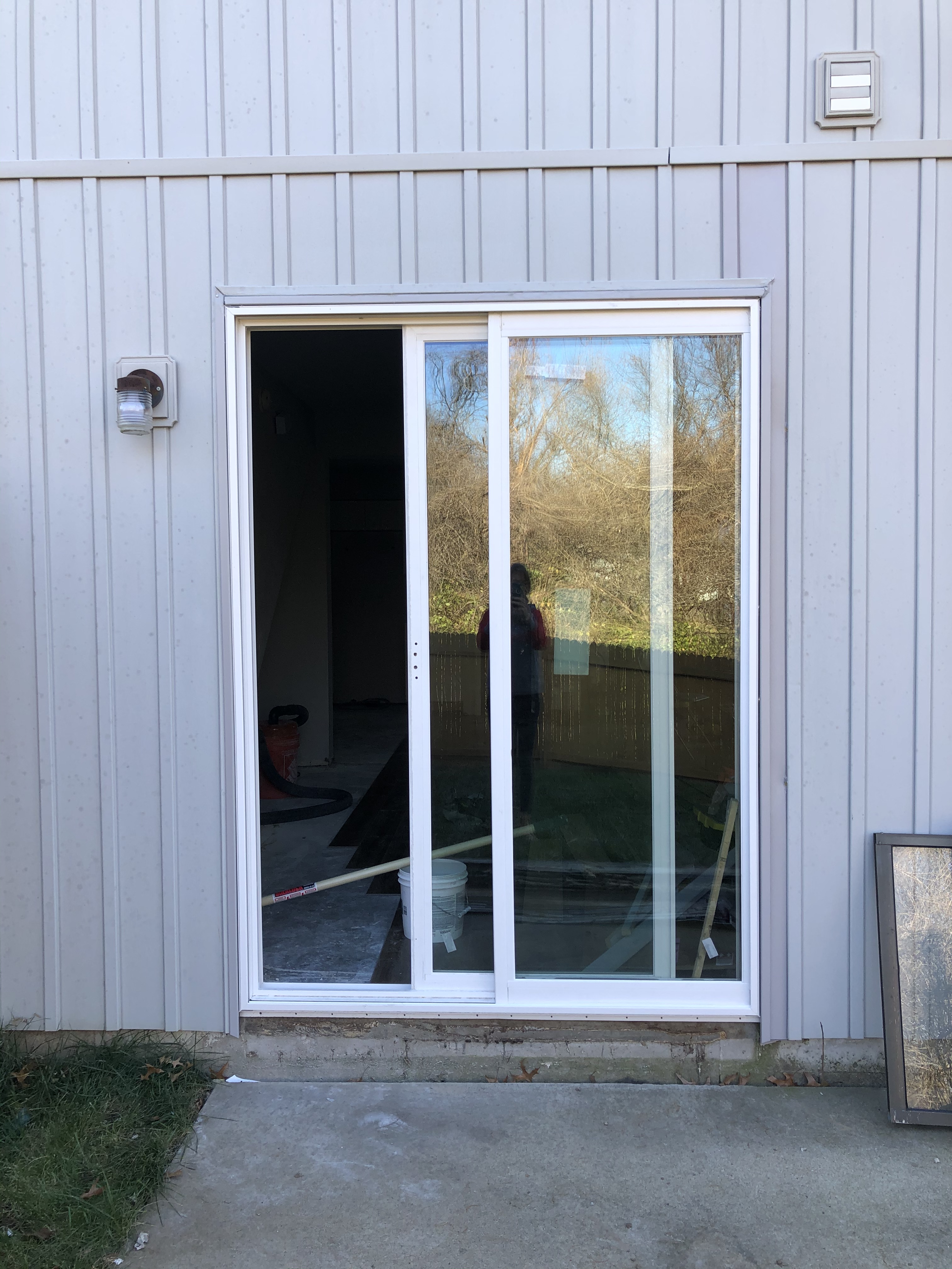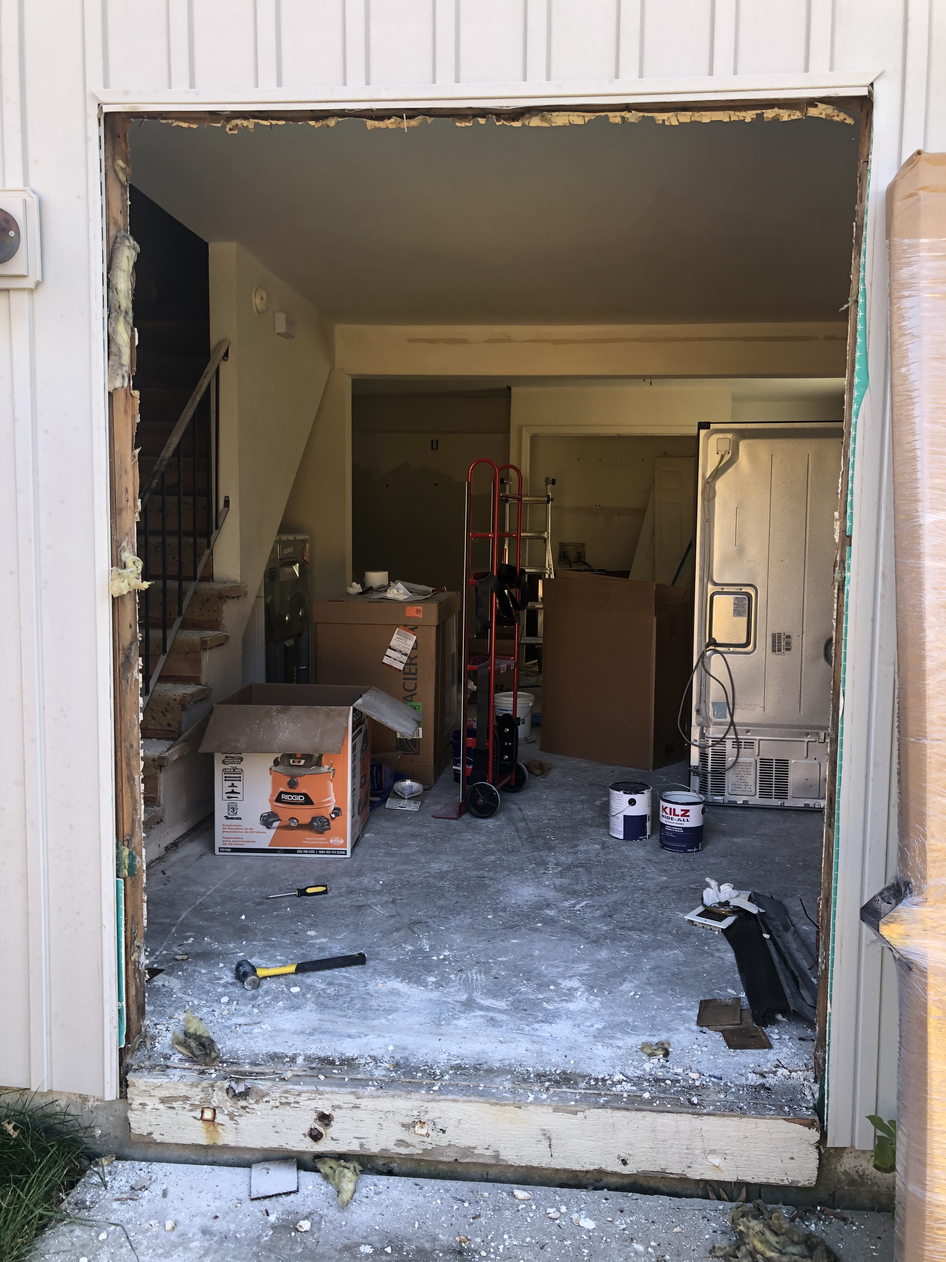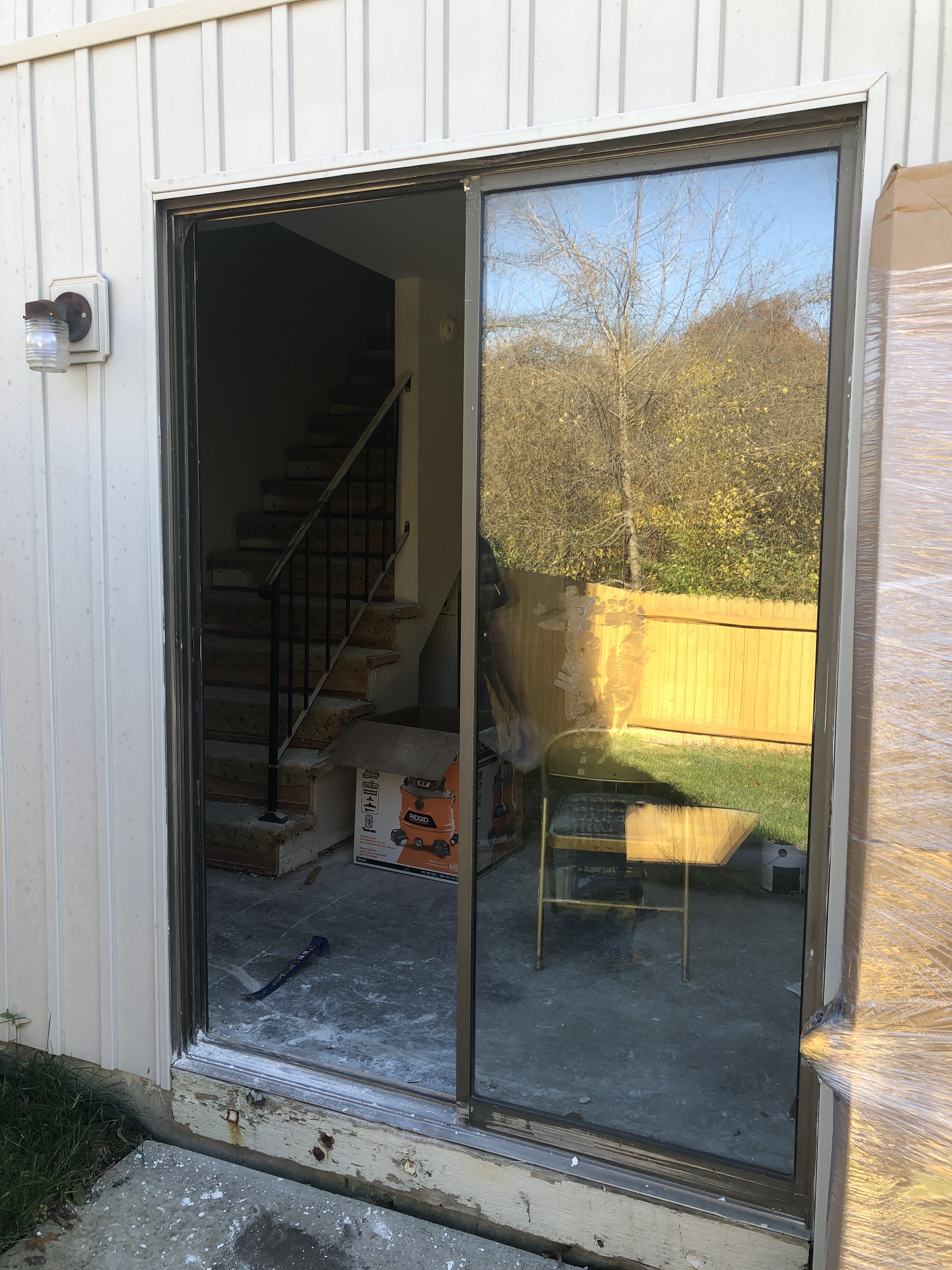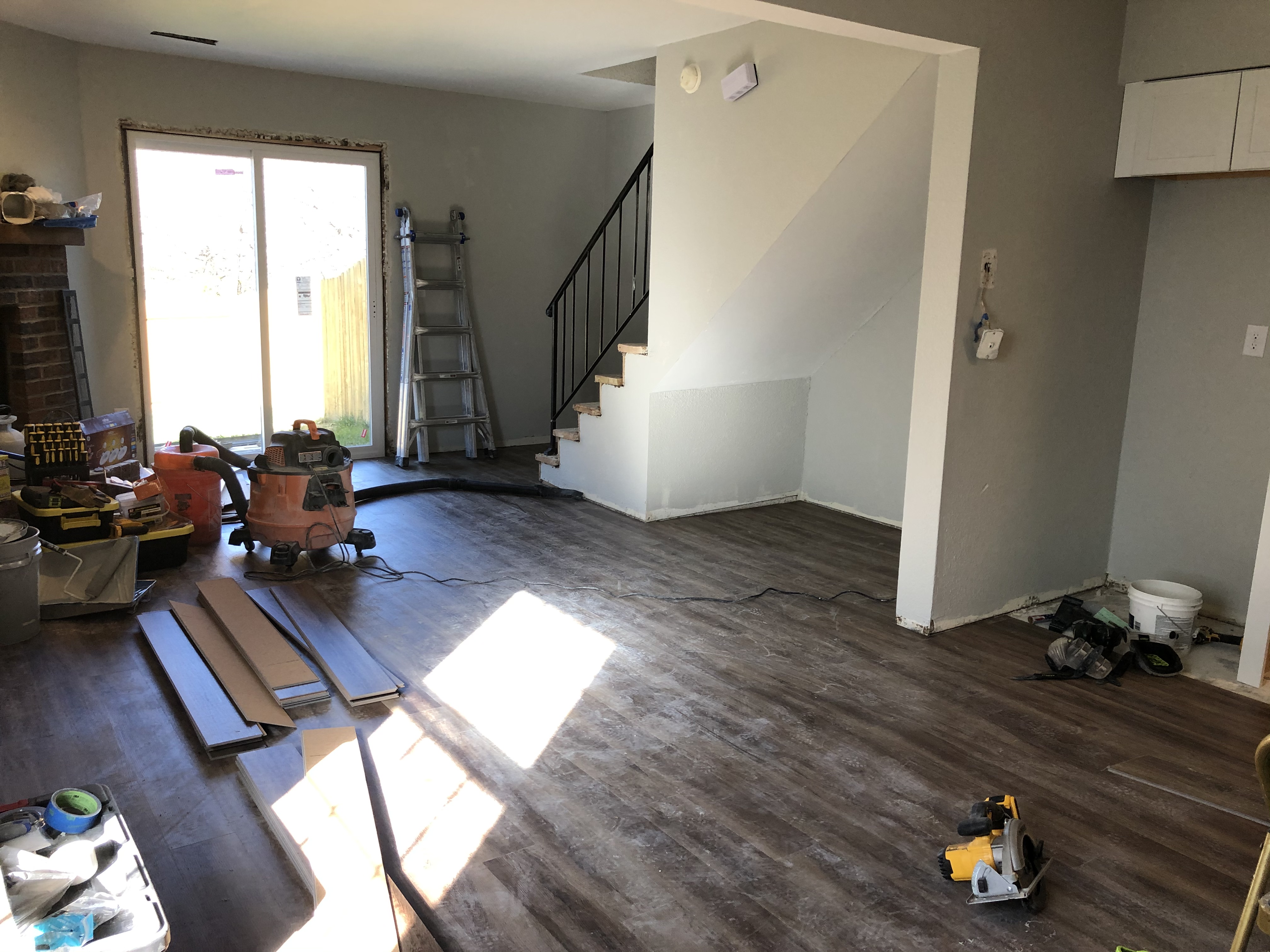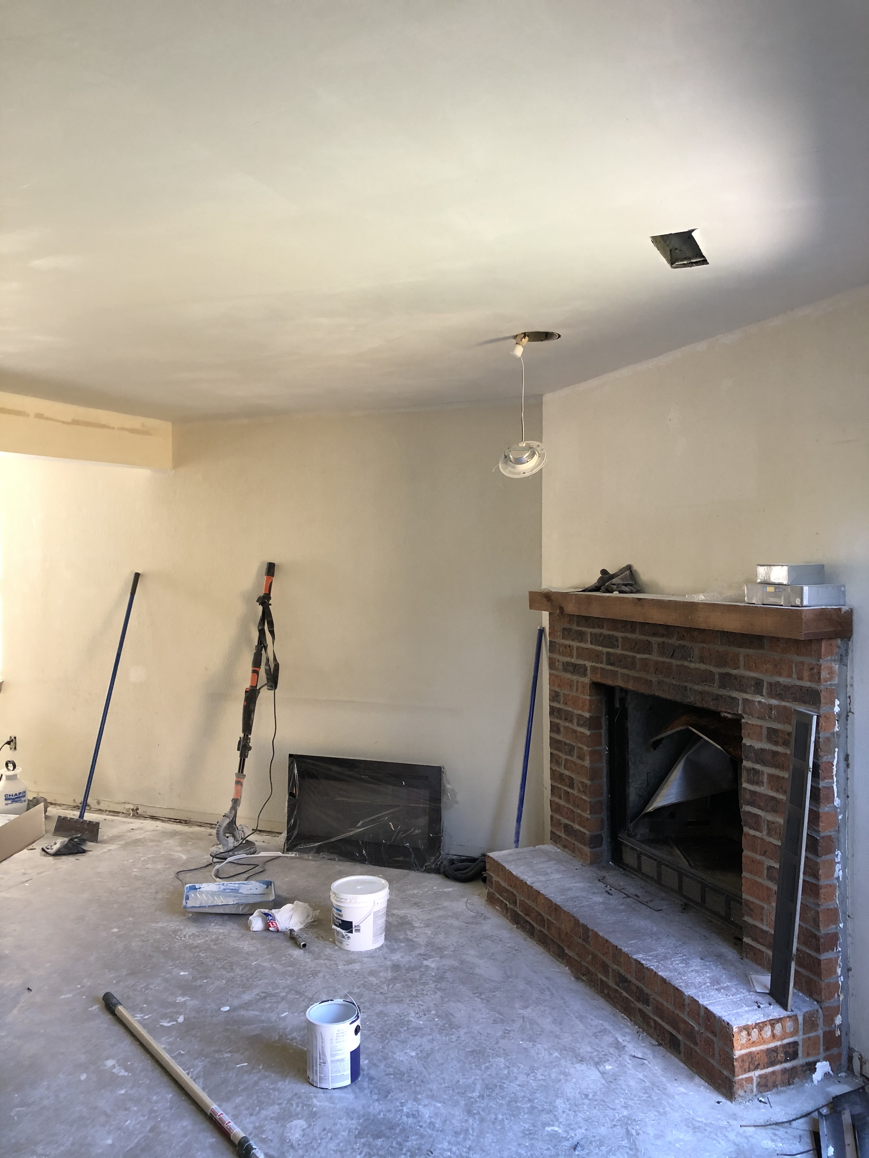 The living room was probably the easiest fix. Apart from having to fill what felt like 3,209,230,852 nail holes and scraping and skim coating the ceiling, everything else was pretty straight forward. Paint the walls, install the LVP, new baseboards, new electrical, new electric fireplace insert… OH AND DON’T DIE WHEN A SLIDING DOOR ALMOST FALLS ON YOU. It’s fine. We’re fine. Everything is fine.