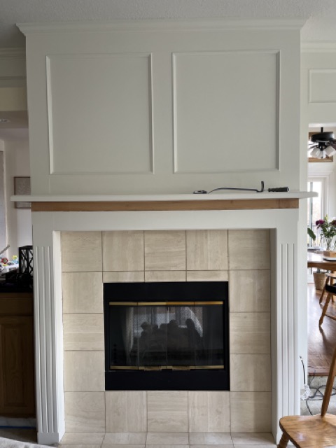 We knew that we wanted to mount our TV above the fireplace so we could orient the furniture to make the fireplace the focal point. The original woodwork had two boxes above the fireplace, which wouldn’t allow us to mount the TV, so we opted to convert that into one box when we rebuilt the mantel. We knew we’d have to redo some of the woodwork when we shortened the mantel in order to make up for the shorter height, so it seemed like the perfect time to turn the two boxes into one. We also decided to run the wiring for the TV behind the woodwork (while making sure we were in code with the gas insert) so we wouldn’t have any exposed wires after we were done.