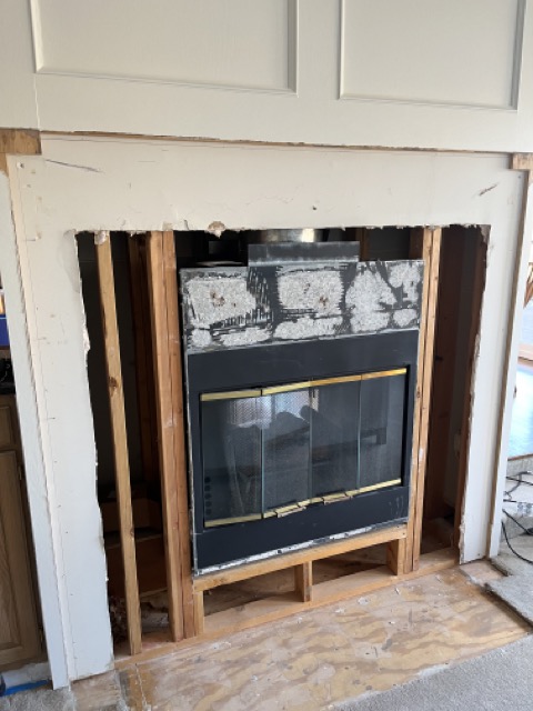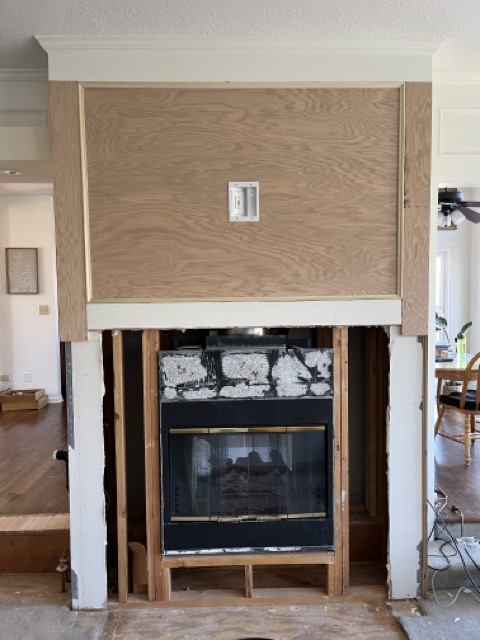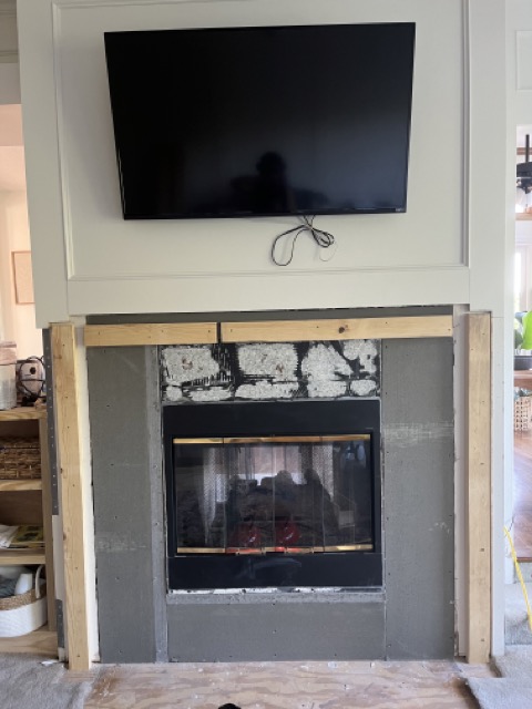 The last picture shows the blocking I used to mount the new mantel to the wall, along with the mounted TV with the single box and the new cement backer board.