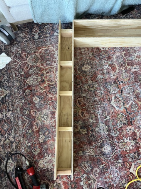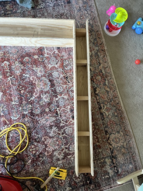I was terrible about taking progress photos while building this one because it was my first time building a mantel and I had very limited time in the sweltering summer evenings after Florence went to bed and before all the neighbors would hate me for making noise too late at night. Here are two photos of the mantel base as seen from the backside (the side that is attached to the wall).