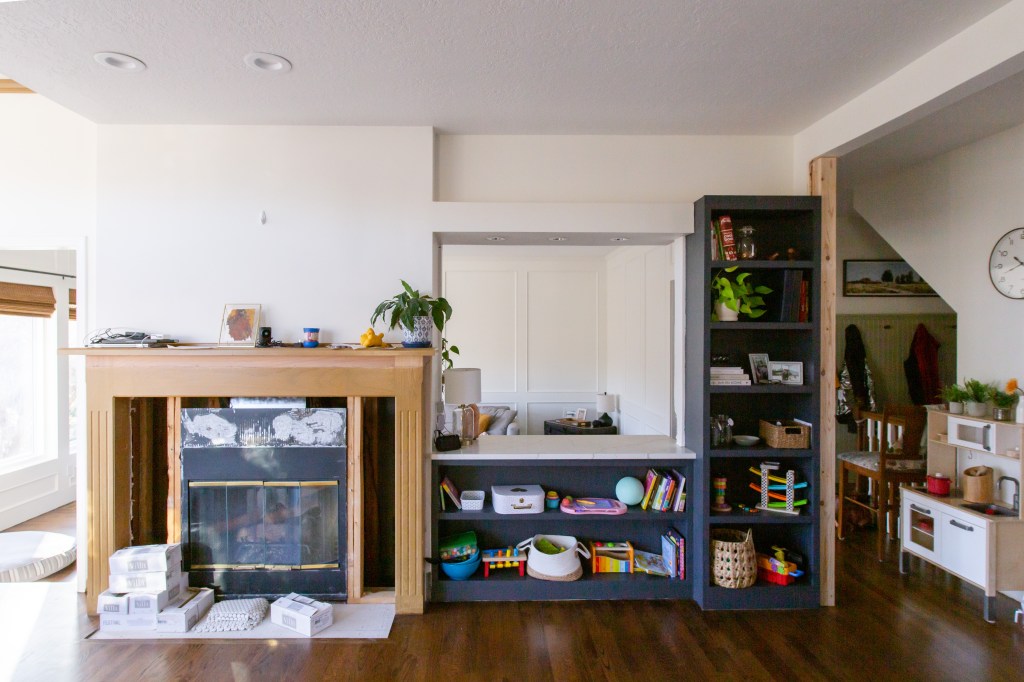 We have a beautiful double-sided gas fireplace between the living room and the kitchen area. It’s fun in that the living room is actually sunken down a few steps, so the dimensions of the mantels on each side vary, but they were designed with the same details so they look cohesive. I don’t hate the style, but I also never loved it. However, I knew I wanted to rebuild the mantels because the living room side was SO TALL that I couldn’t even see the top of it, so I was always losing items up there and dusting was never very effective since I seemed to miss a spot every single time. I wish I had a photo of me standing beside the old mantle for scale. Unfortunately, I decided to tear the whole thing out on a whim one day, thinking that finally taking a step forward with the renovations would help me feel better. Joke’s on me, it’s been seven months and I’m just now getting around to finishing it.